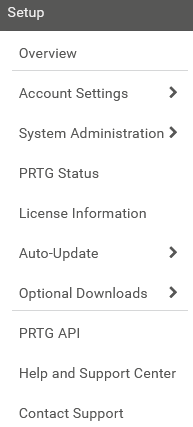 Open information about the Software Auto-Update status of your PRTG installation. On this page, you can also download and install available updates. Hover over Auto-Update to show other options: