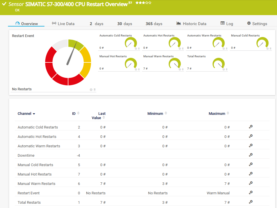 The SIMATIC S7-300/400 CPU Restart Overview sensor monitors the CPU restart events of a Siemens S7-300 or S7-400 Programmable Logic Controller (PLC) via the S7 protocol.